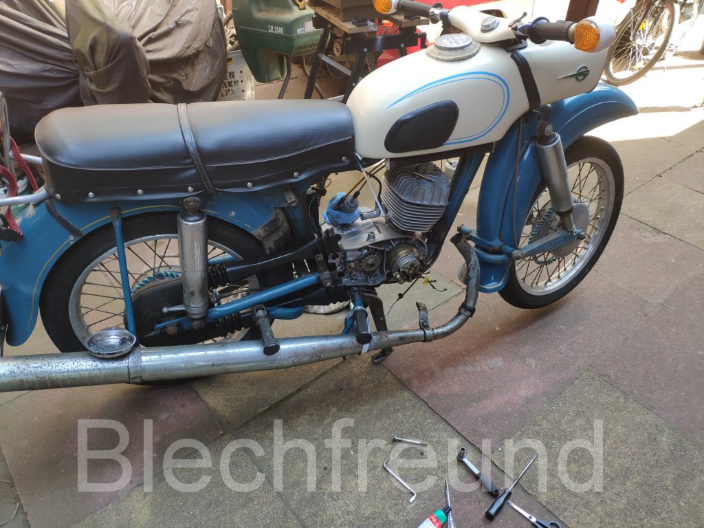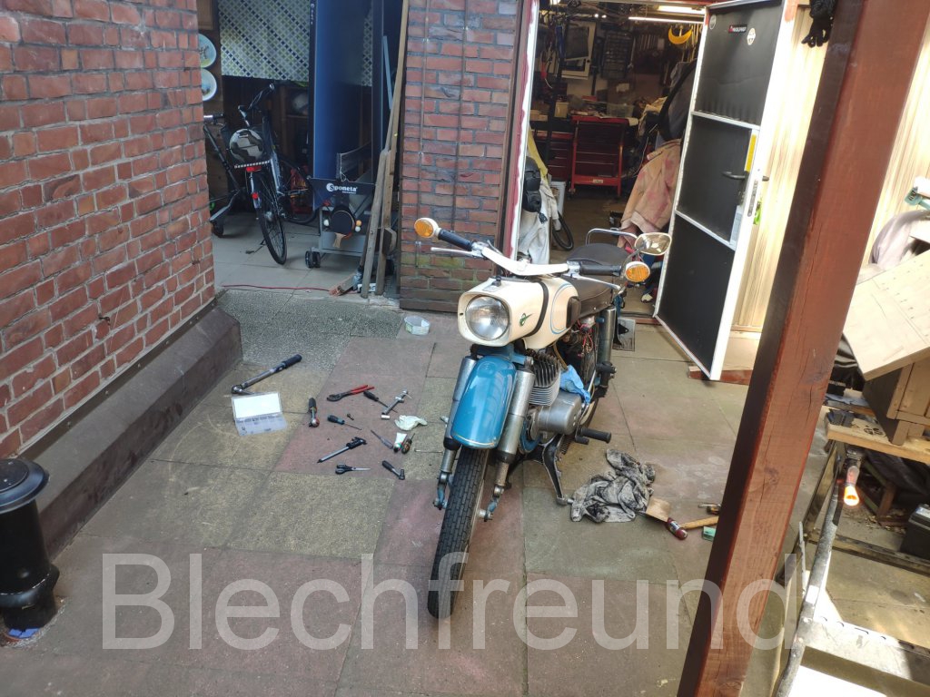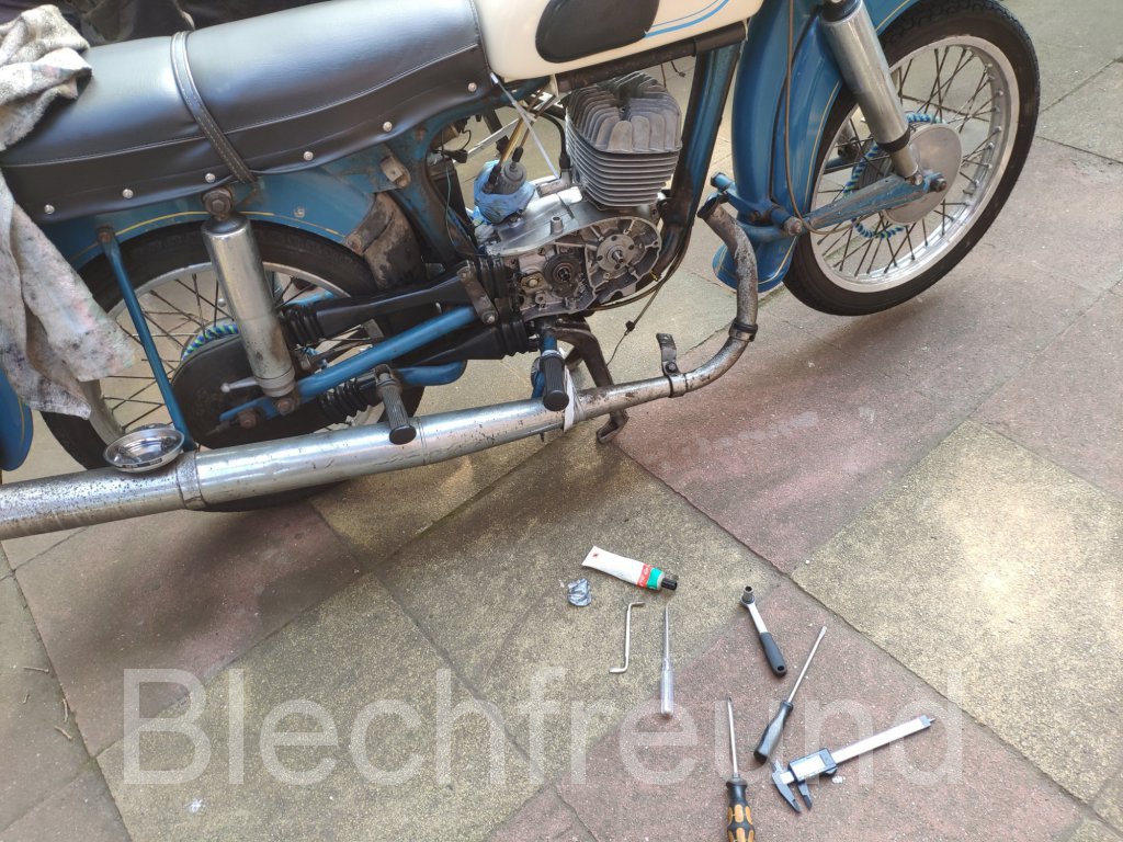 Weiter geht es dann mit dem Einstellen der Kette und dem Ausrichten des Hinterrades. Dem Öl-Einfüllen, den Prüfen der Zündung, des Vergasers, dem Wechsel der rechten Fußraste und wenn irgendwann lange Weile ist liegen auch zwei Sätze mit neuen Bremsbelägen schon bereit. Es geht voran. Die Probefahrt naht.
