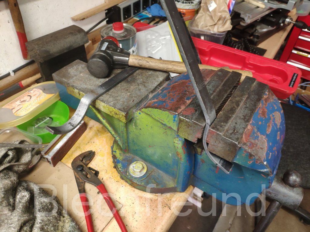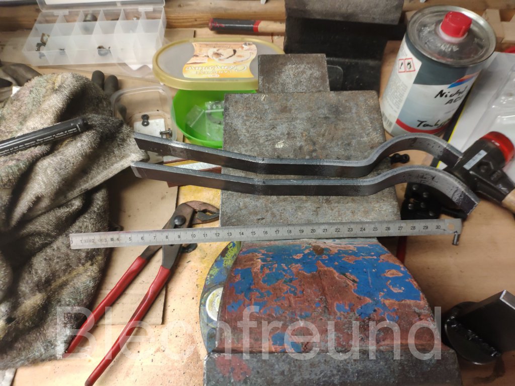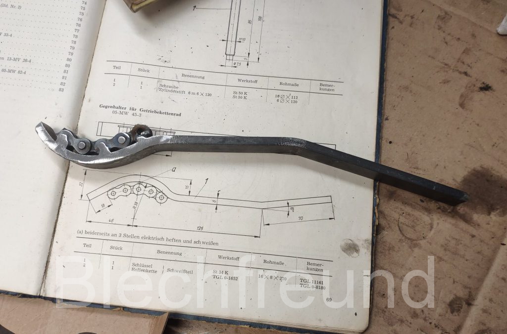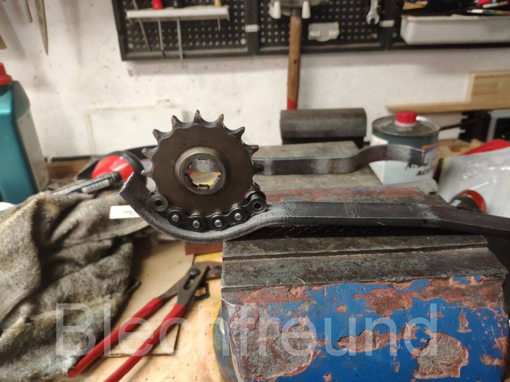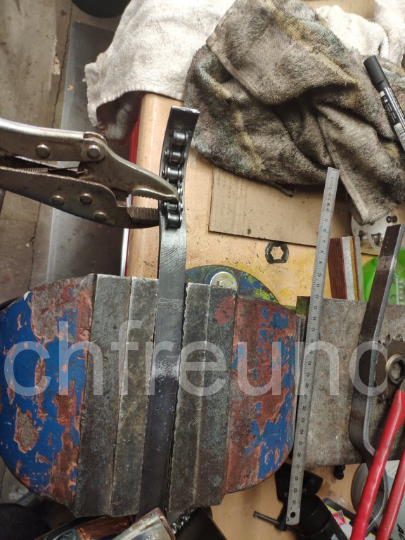 Das Spezialwerkzeug ist relativ einfach und so wird dieses nachgebaut. Flachstahl 20×8 wird abgelängt und im Schraubstock die Rundung gebogen. Muster für die Rundung ist ein Kettenstück auf dem alten Ritzel. Für den Knick hinter der Rundung wird mit dem Kunststoffhammer nachgeholfen. Der Winkel am Ende wird auch mit leichter Hammerunterstützung gebogen. Die Kette wird am Rand positioniert, da der Flachstahl 4 mm zu breit war. Mit dem MIG-Schweißgerät wurde die Kette angepunktet. Die Seite wurde anschließend noch mit der Fächerscheibe geplant.